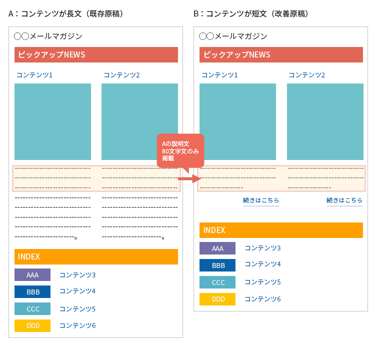 長文となる既存原稿と短文のABテストを行い、短文の改善効果を検証します。