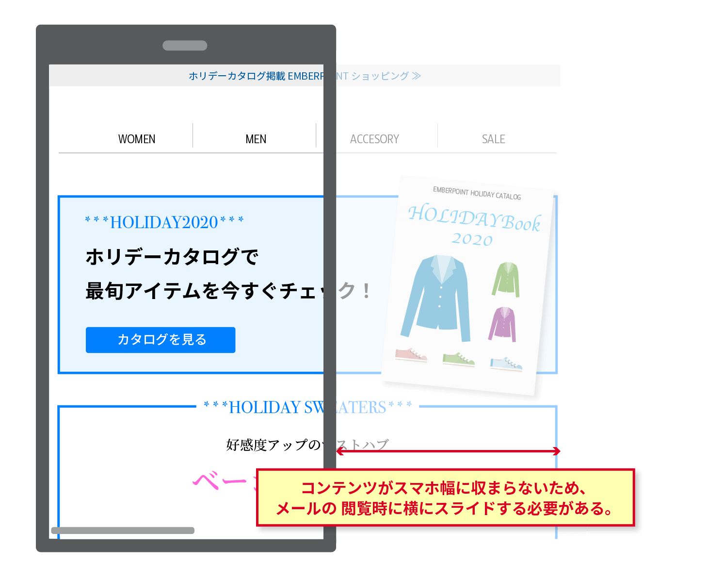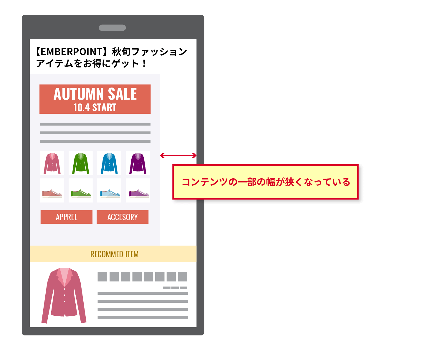 上の画像は、実際に私が受信したメールを参考に作成しました。コンテンツの一部が小さく表示されているため開封時に違和感を抱くだけでなく、テキストも読みづらくストレスを感じます。