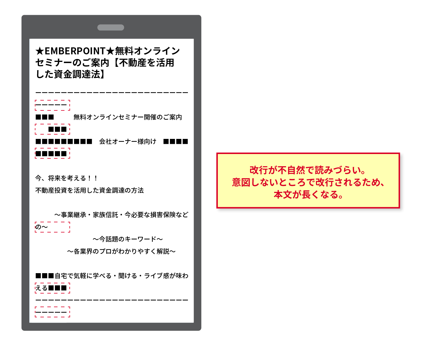 PCでの閲覧を前提に配置された罫線や文章が、スマホ閲覧時には不自然に改行されるため読みづらくなります。