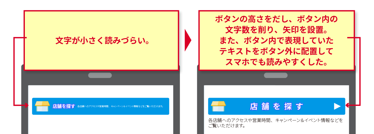 画像内に含めたい文字を削らなければいけない場合は、削ったテキストをボタン下に配置する、遷移先のページで説明するなどで対応することをおすすめします。
