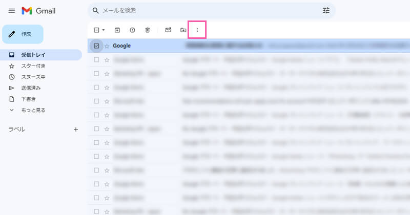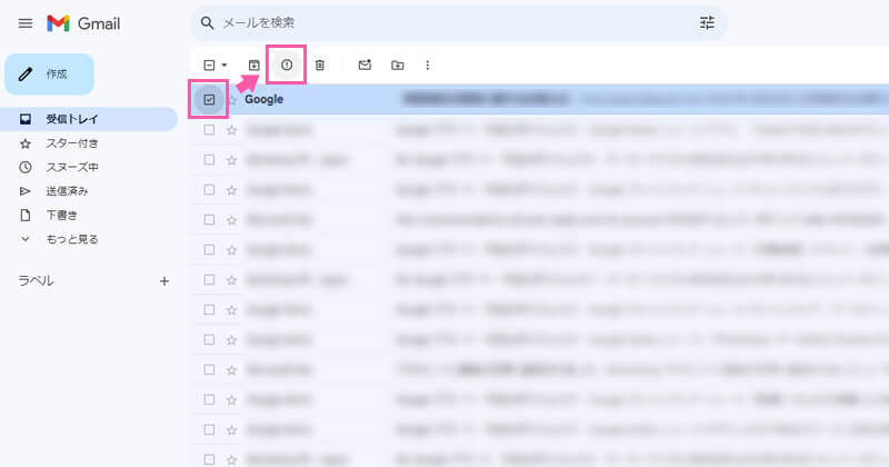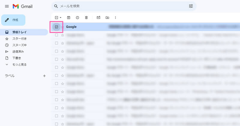 ①画面左の受信トレイを開き、迷惑メールに設定したいメールの左側にチェックを入れます。複数選択も可能です。