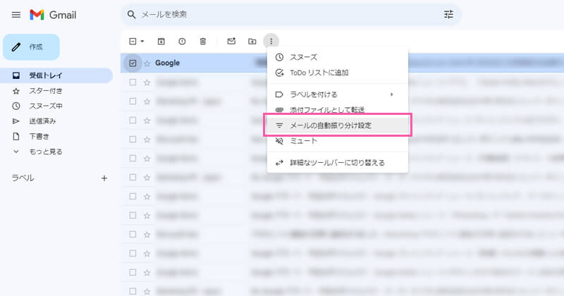 ①自動振り分けをしたいメールを選択します。