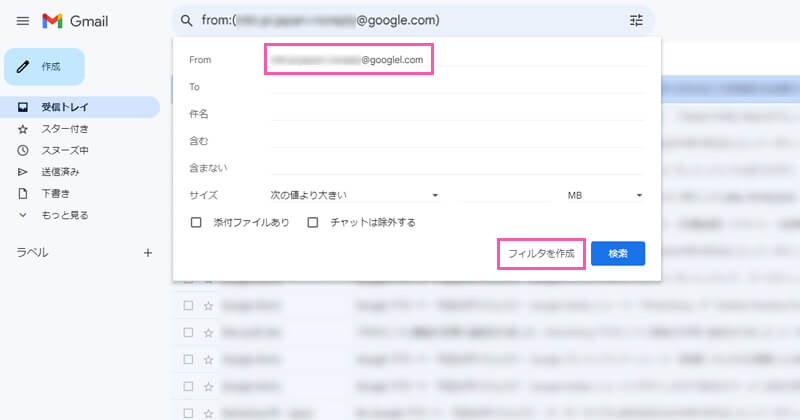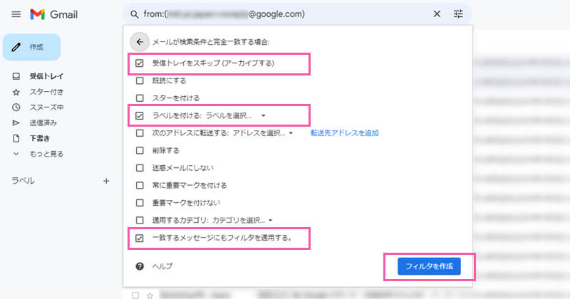 ④「From」の項目に、さきほど選択したメールアドレスが表示されているのを確認し、右下の「フィルタを作成」を選択します。
