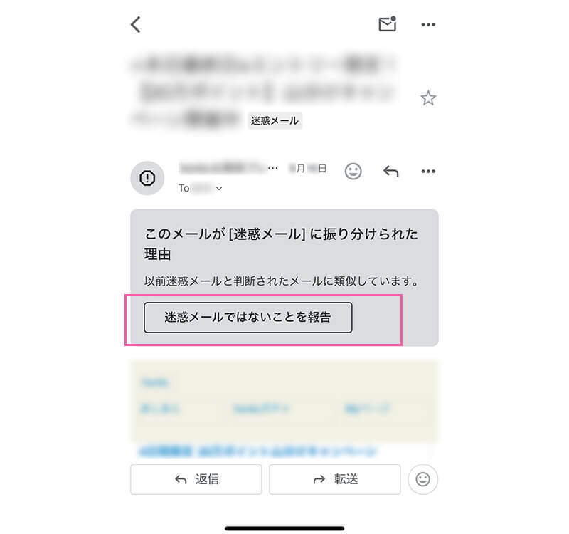 ②解除したいメールを開き、メール上部の「迷惑メールではないことを報告」を選択します。