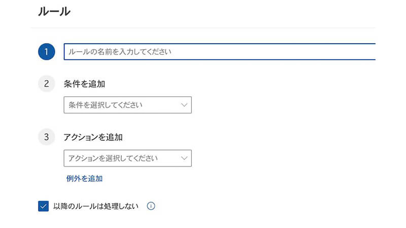 3. 「メール」→「ルール」→「新しいルールの追加」をクリックして、自動振り分けのルールを設定する。「条件」で振り分けしたいメール、アクションで振り分けしたいフォルダを設定。決定したら保存をクリック
