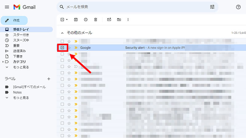 まずはWebページのGmailにログインし、受信トレイを表示します。振り分けたいメールを探して、左側のボックスにチェックを入れましょう。なお、ここではGoogleのメールアドレスを例に説明していきます。
