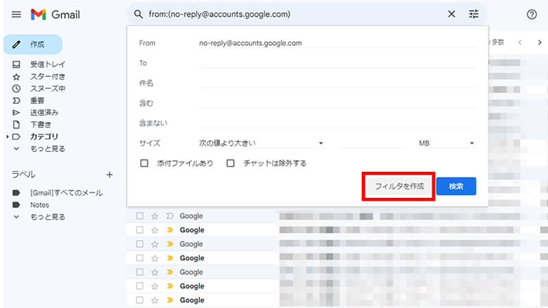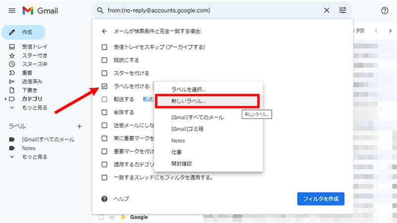 なお、過去のメールにも設定を反映したい場合は「既存のメールに新しいフィルタを適用する」をチェックしておきましょう。