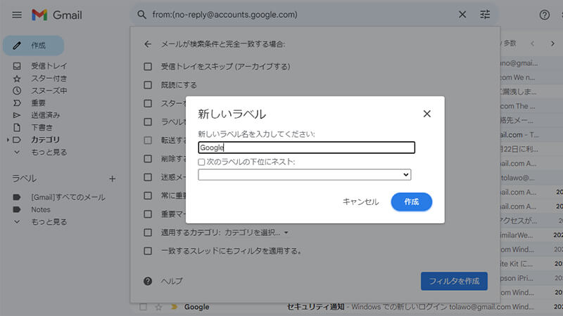 なお、最下部の「一致するスレッドにもフィルタを適用する」をチェックすると、すでに受信している該当メールが自動で振り分けられます。過去のメールも振り分けたい場合はここもチェックしておきましょう。