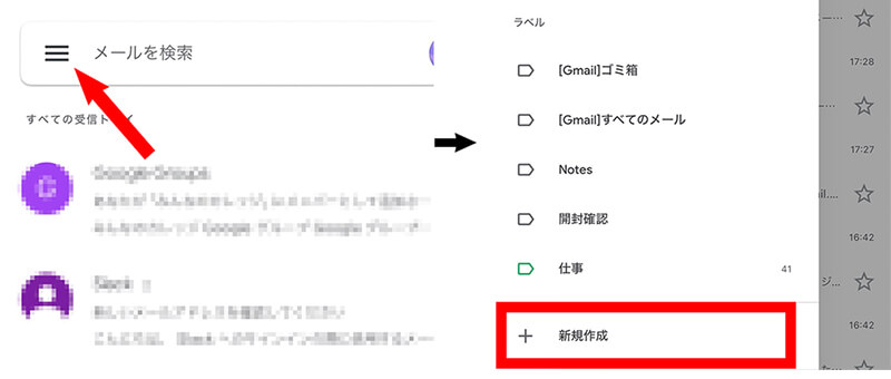 まずはGmailアプリを開き、上部左側にあるマークをタップします。メニューが表示されるので、「ラベル」の一番下にある「新規作成」を選択してください。