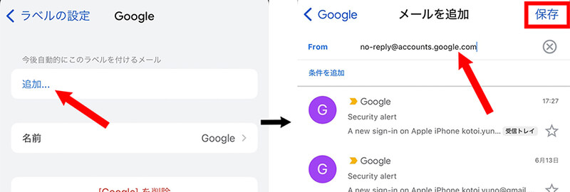 コピー&ペーストが可能なため、事前にメールアドレスをコピーしておくと入力の手間が省けます。入力すると該当するメールが表示されるので、誤りがないか確認してから「保存」をタップします。