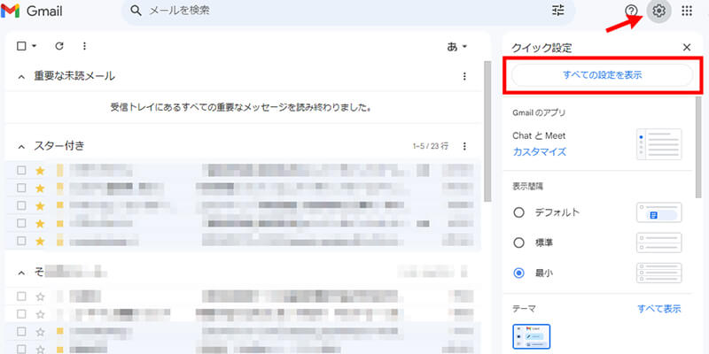 自動振り分け設定を別のアカウントでも反映したいときは、フィルタのエクスポート・インポート機能を使用します。Gmailにログインし、画面右上の歯車マークから「すべての設定を表示」をクリックしましょう。