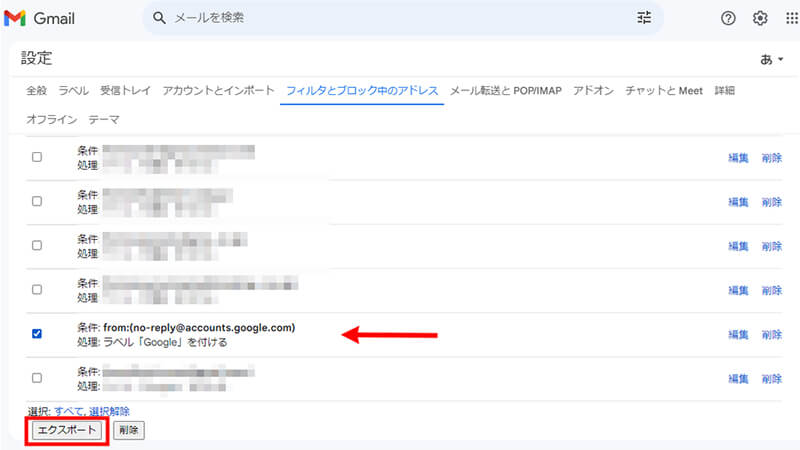 希望の条件すべてにチェックを入れ、下部の「エクスポート」をクリック。「mailFilters.xml」という名前のファイルが作られるので、任意の場所に保存します。