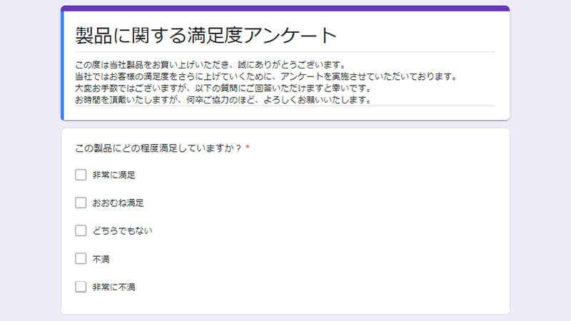 例えば満足度を測定する場合は、「非常に満足・満足 ・ どちらでもない ・不満、・非常に不満」といった風に明確に区分けすると選択しやすくなり、回答するスピードも上がります。