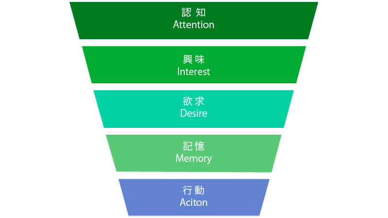 マーケティングでよく利用されるモデル「AIDMA」がベースで、最もよく知られている基本的なファネルと言えます。