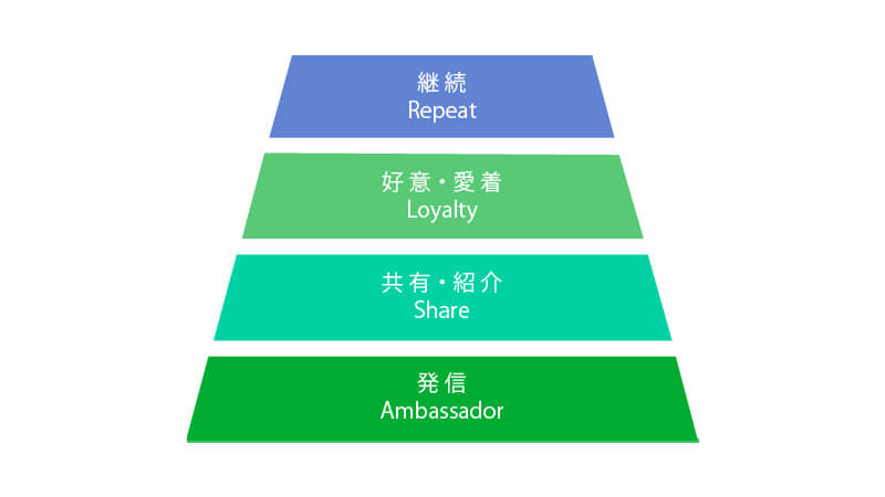その商品を気に入った場合、どのように他者に勧めていくのかを3段階で示しています。購買までのファネルと違い、三角形で裾へ広がる形になっているのが特徴です。