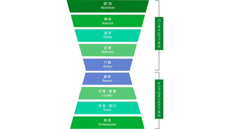 購買へ導くマーケティング施策と購入後のコミュニケーションの取り方、顧客の発信・インフルエンス強化など、一連のマーケティングをトータルで行う場合に採用されるファネルです。
