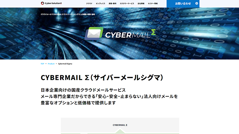 Cybermail Σは、サイバーソリューションズ株式会社が提供するセキュリティ重視のクラウドメールサービスです。