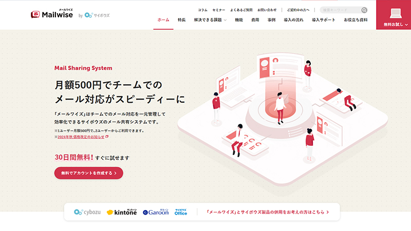 メールワイズは、サイボウズ株式会社が提供する問い合わせ管理に最適なクラウドメールサービスです。グループウェアとの連携が強力で、社内の情報共有やタスク管理が円滑に行えます。