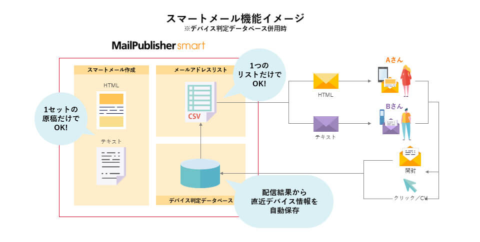 今回リリースした「スマートメール」は、1セットの原稿・1つのメールアドレスリストを用意し、1回の配信設定を行うだけで、受信環境に応じて自動的にHTMLメールとテキストメールを送り分ける機能です。オプションのデバイス判定データベース機能※1※2を併用することで、過去のメール配信結果から取得したデバイス(受信環境)の情報をもとに、送り分けの精度を高めることもできます。