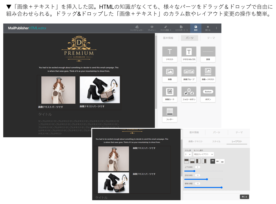 画像・テキスト・ボタンといった、HTMLメールを構成するパーツを、自由に組み換えることができるだけでなく、各パーツの間隔、余白、カラム数の設定を合わせることで、オリジナリティあるレイアウトを作成することができます。また、パーツの中身は、テキストであれば「フォントの種類・サイズ・配色」、図形であれば、「サイズ・配色・形状」等、非常に細かい調整ができます。「MailPublisher HTML Editor」であれば、このような高い表現力によって、意図したデザインをエディター上で忠実に再現することができます。
